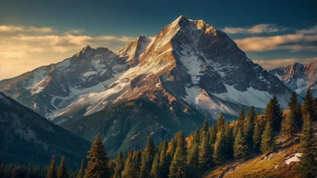 Sunset in the mountains with coniferous forest and snow-capped peaks