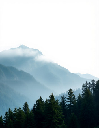 Photography captures snow-dusted mountain peaks partially obscured by mist, framed by lush evergreen trees, evoking a calm and minimalistic ambiance