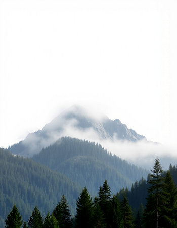 This captivating image showcases a majestic mountain peak shrouded in mist, set against a tranquil forest backdrop, invoking serenity.