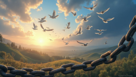 A breathtaking landscape unfolds as a chain lies in the foreground, symbolizing restraint, while a flock of doves soars gracefully against a vibrant sunset. The warm hues of orange and gold illuminate the rolling hills, creating a striking contrast between the heavy chain and the lightness of the birds, evoking a sense of hope and liberation.