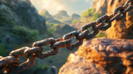 A close-up view of a rusty chain set against a backdrop of rocky terrain and lush greenery, highlighting the beauty of nature under soft sunlight.