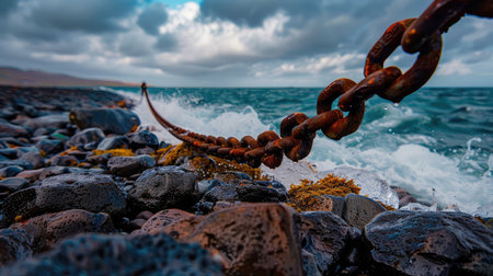 A rustic chain rests on the rocky shore as ocean waves crash around it, under a moody sky filled with dramatic clouds, capturing nature's beauty.