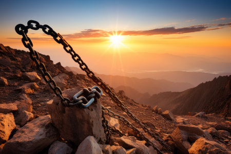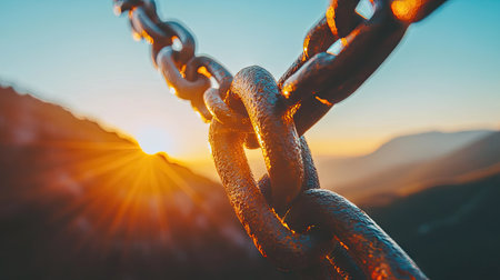 Close-up view of a metal chain link against a backdrop of mountains and a vibrant sunrise. The chain links are in sharp focus, while the mountains and sky are softly blurred in the background. The image showcases the texture of the metal chain and the warm, golden hues of the sunrise.