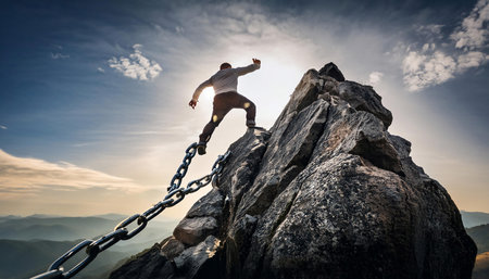 Illustration depicting the concept of struggle and overcoming obstacles, featuring symbols like a person climbing a steep mountain, a broken chain, and a determined face symbolizing challenges, perseverance, and triumph. Ideal for topics related to personal growth, adversity, and resilience.