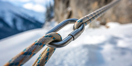 A strong carabiner links climbing ropes in a stunning snowy landscape under bright skies.