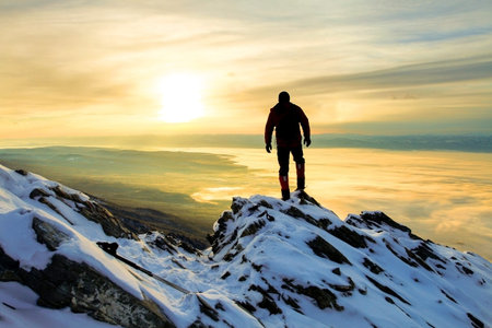 Silhouette of alone tourist standing on snowy mountain top enjoying view and achievement on bright sunny winter day. Adventure, outdoors activities and healthy lifestyle concept.
