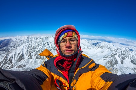mountaineer on the top of a mountain in the background of the landscape of snowy mountains