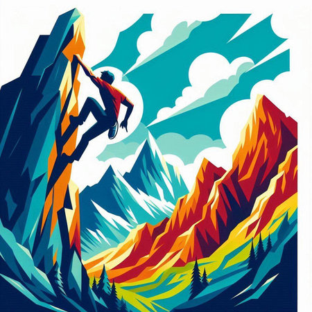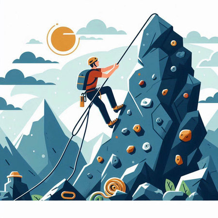 Mountaineer climbing up to the top of a mountain, vector illustration