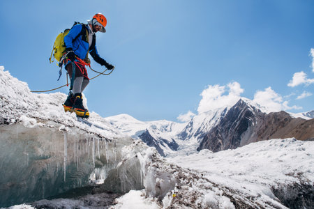 Climber in vibrant gear leaps over crevasse on icy glacier during Lenin peak ascent under clear sky with snow-covered peaks in background. Extreme active people, high-altitude mountaineering concept.