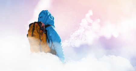 Mountaineer with backpack on top of mountain, travel, mountaineering concept