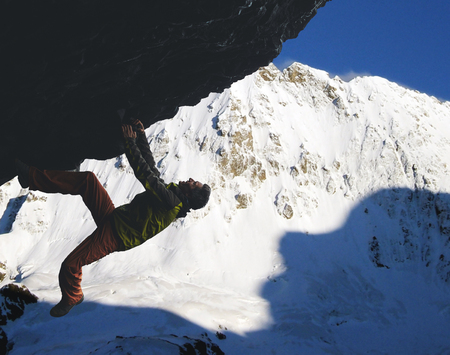 A silhouette of man climbing on rock, mountain at sunset. Adrenaline, strenght, ambition,climber to conquer the peak.