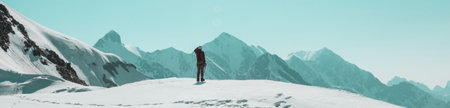 A man in a black jacket and hat standing on top of a mountain. Generative AI image.