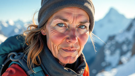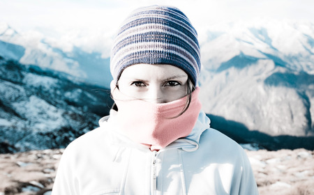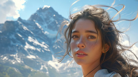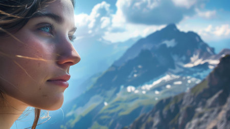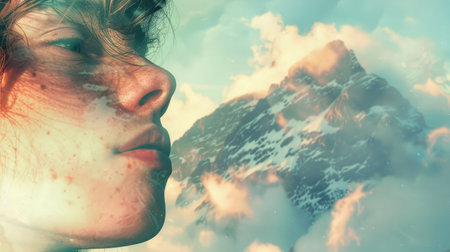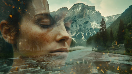 Double exposure portrait of attractive girl combined with photograph of snowy mountain