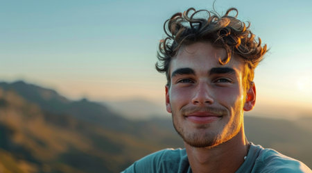the guy stands against the background of snowy mountains with snow-capped peaks