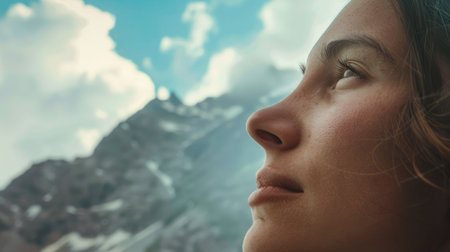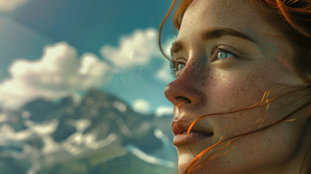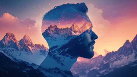 Close-up of a captivating eye blended with a panoramic landscape featuring vibrant mountains