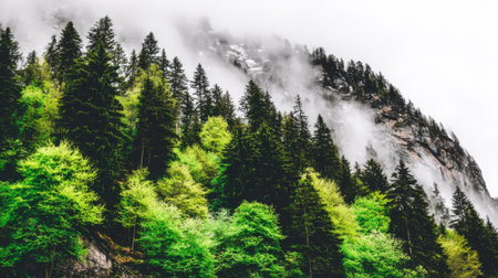 Foggy alpine slope with mixed evergreens and bright spring foliage