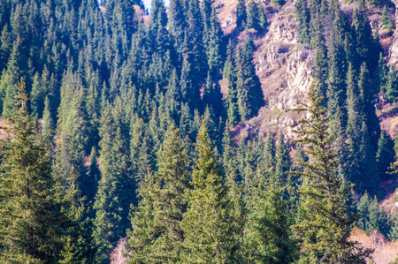 A Tapestry of Nature's Colors This stunning view of the Tien Shan in autumn is a kaleidoscope of vibrant foliage and evergreen pine trees against a backdrop of towering mountains.