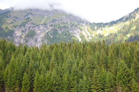 rocky high mountains. tops in the snow. tall spruce in the foreground. Forest fog laid on the tops of the trees weather mountains. Clouded Mountainside and Evergreen Tree Scape.