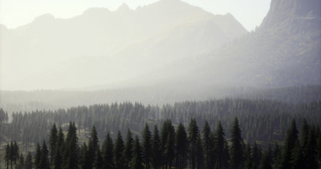 Moody capture of mountain forest with morning mist