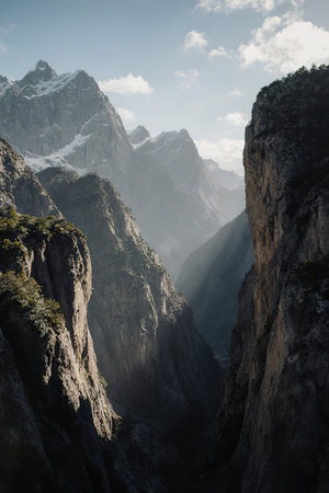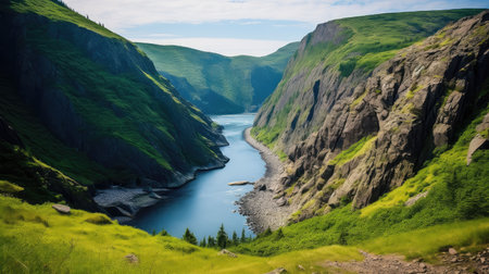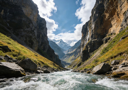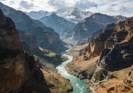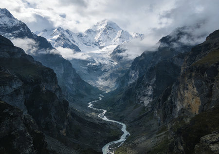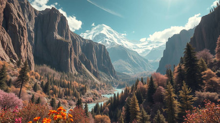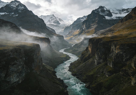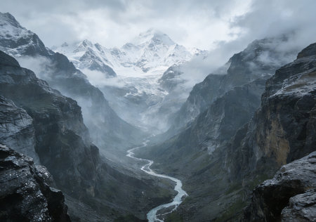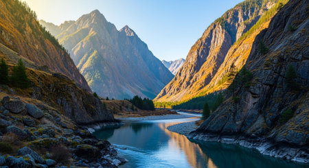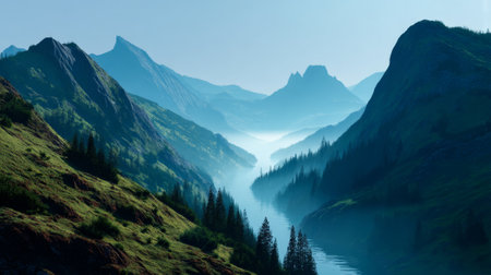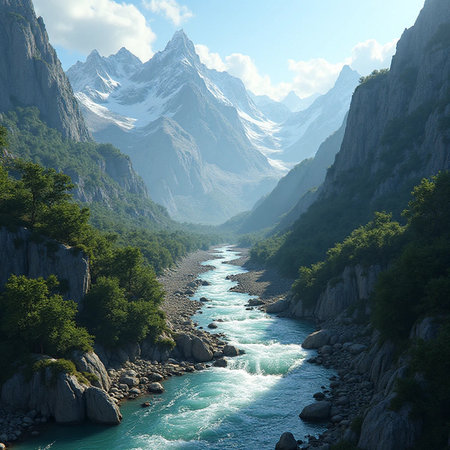 A scenic landscape showcases towering mountain peaks flanking a flowing river. The image displays a natural setting with varying shades of green, brown, and grey. Overhead lighting and atmospheric perspective add depth. The composition could be useful for travel brochures or environmental publications.