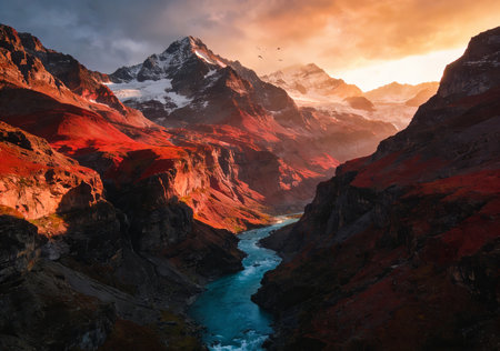 Beautiful mountain landscape with river and snowcapped peaks at sunset