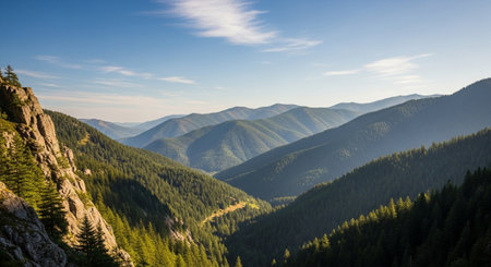 This stunning mountain valley scene captures the essence of nature with its vibrant greenery and soft blue sky, offering a serene escape into the great outdoors.