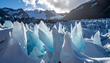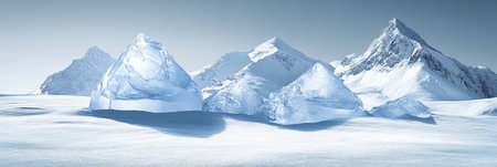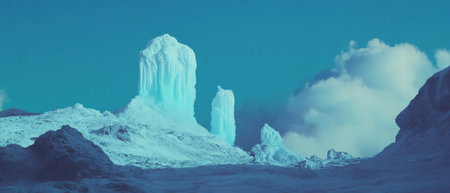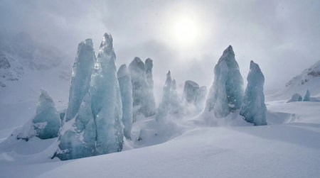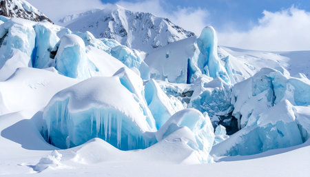 Stunning ice sculptures in a snowy mountain landscape. Winter wonderland with blue ice and majestic peaks.