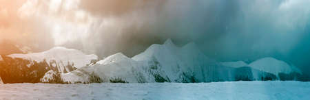 Beautiful winter landscape with snow-capped mountain peaks in the background
