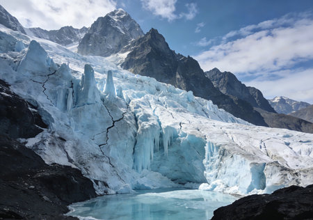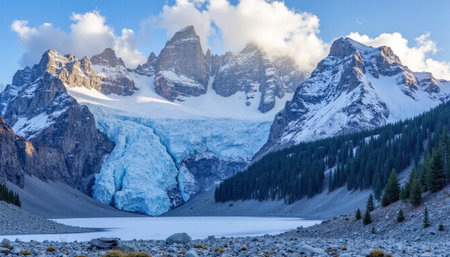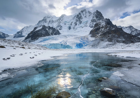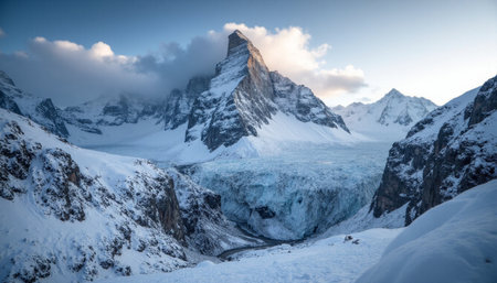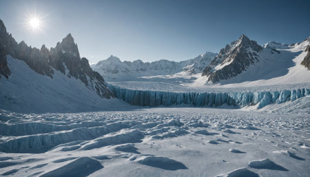 Stunning glacial landscape with imposing mountains. Icy terrain and cold atmosphere.