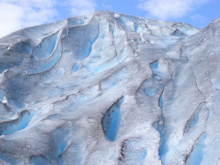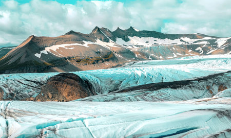 Beautiful scenery on the mountains and the glacier Svartisen landscape in Norway scandinavian nature landmarks ecology concept. Blue snow and ice.