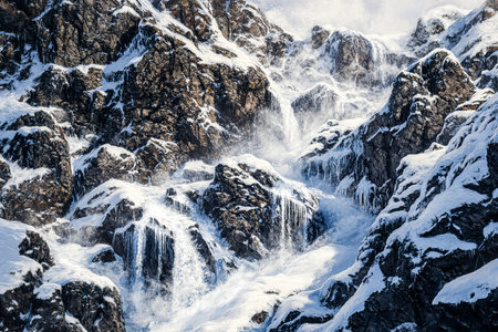 Majestic Icelandic Winter Landscape with Snow-Covered Rocks and Towering Waterfall