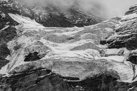 Closeup of a glacier, snow and rocks of San José Vulcano viewed from Lo Valdés Valley, Cajón del Maipo, Central Andes of Chile.