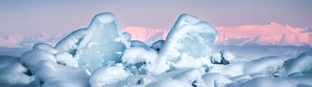 Transparent blue ice floes piled in ice hummocks against a blue sky on a sunny day. Unusual winter landscape of the frozen lake Baikal. Natural cold background. Siberia, Russia.