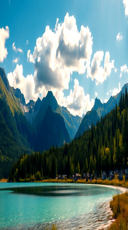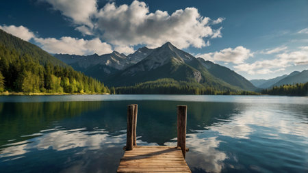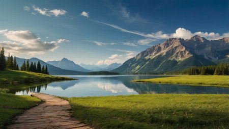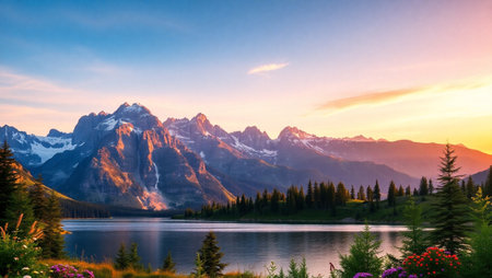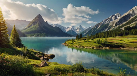 An idyllic image suitable for travel guides, environmental conservation campaigns, or as a breathtaking backdrop for meditation and wellness spaces | This picture unfolds a serene alpine setting where a crystal-clear lake reflects a majestic mountain peak and a blue sky scattered with fluffy clouds. The verdant slopes dotted with evergreens highlight the robust life and unspoiled beauty of high-altitude ecosystems. In the forefront, a vibrant tapestry of wildflowers in full bloom—dabs of yellow, red, and purple—creates a natural mosaic that celebrates biodiversity and the fleeting splendor of seasonal changes. The mirror-like water captures the dual essence of sky and earth, creating a visual bridge that unites the elements in tranquil harmony. Sunlight filters through the scene with a soft glow, accentuating textures and colors, and instilling a sense of peace and timelessness representative of such pristine wilderness areas | Ideal for use in environmental publications to illustrate the biodiversity of mountain habitats, as part of a collection in nature photography exhibitions, or to set a calming mood in health and wellness settings. It can also serve as an inspiring visual for articles on outdoor recreation or as part of a marketing campaign for eco-friendly travel destinations | a pristine landscape photograph featuring an alpine lake, wildflowers, mountain scenery, and forested slopes, encapsulated under bright daylight which highlights the natural beauty and vivid colors of the flora and landscape, with plenty of room for text or design elements