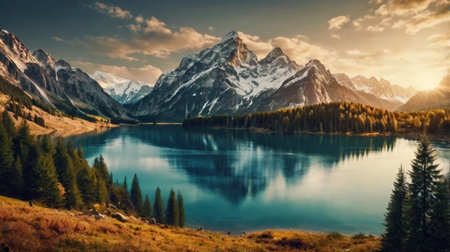 Beautiful alpine lake with reflection of mountains in the water at sunrise.