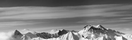 Black and white panoramic view of snow-capped mountain peaks and sky with clouds at windy day. Caucasus Mountains in winter, region Dombay. White background for copy space on top and bottom of image.