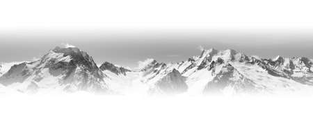 Panoramic view of the snowy mountains in the clouds. Switzerland