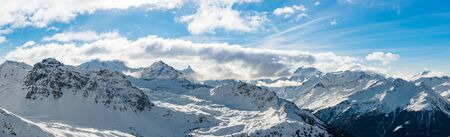 wide angle panoramic view of swiss alps during winter time.