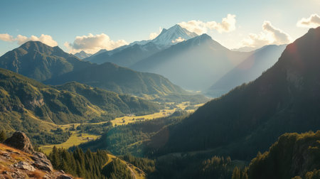 A panoramic view of a mountain range with a valley below. The sun shines brightly over the valley