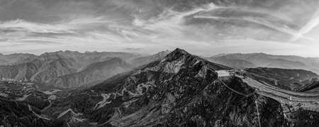 Black and white panoramic view on snowy mountains in winter. Caucasus Mountains, Georgia, region Gudauri.