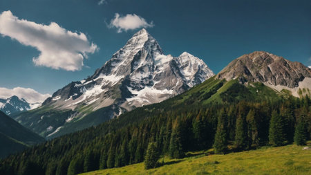 Mountain landscape with coniferous forest and snow-capped peaks