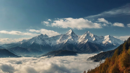 A stunning view of a snow-capped mountain rising majestically above a misty forest, capturing the serene beauty of nature at dawn. The peaceful landscape invites exploration and adventure.