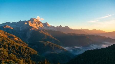 Panoramic view of mountains at sunrise.