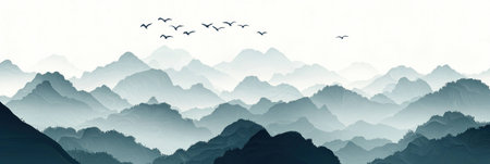 Serene mountain landscape with layers of misty peaks and flying birds, evoking a sense of tranquility and natures beauty. Ideal for landscape and travel themes.
