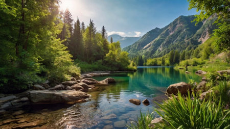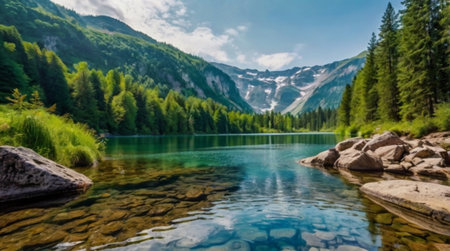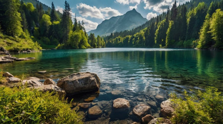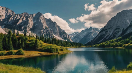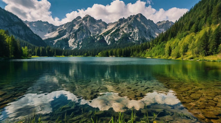 Beautiful mountain lake in the mountains. Summer landscape with a lake.