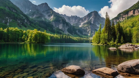 Panoramic view of mountain lake in Tatra National Park, Poland