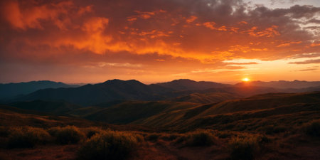 A breathtaking view of a serene sunset over rolling hills and mountains. The sky is filled with vibrant orange and yellow hues, creating a peaceful atmosphere.