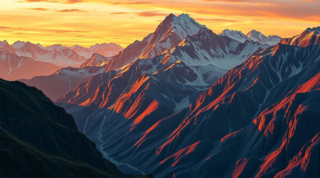 A breathtaking panorama of a vibrant sunset casting its warm hues over snow-covered mountain peaks.