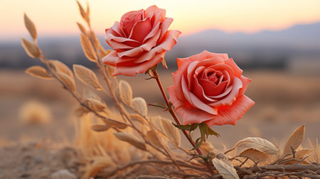 two pink roses in a field with a sunset in the background