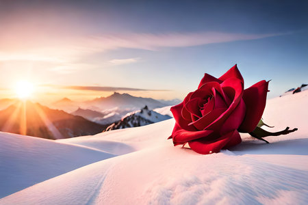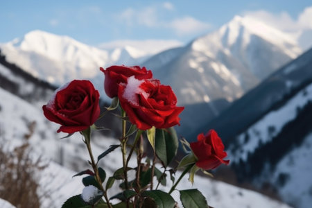 red roses against the background of snow-covered mountains, created with generative ai